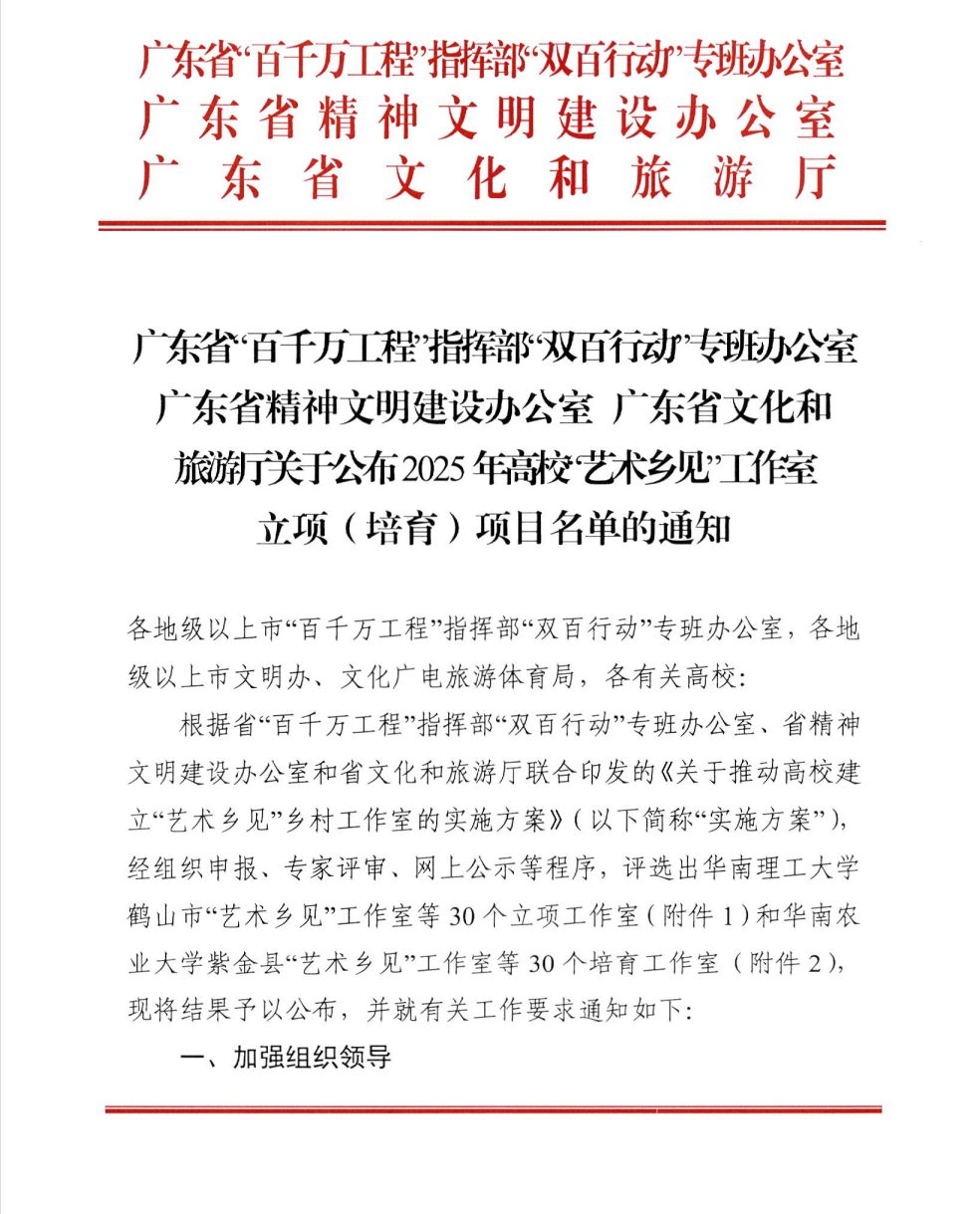 近日,广东省“百千万工程”指挥部“双百行动”专班办公室、广东省精神文明建设办公室及广东省文化和旅游厅等3个单位联合发文,由艺术设计学院院长郭希主持的省级项目“艺术乡见”工作室成功入选广东省2025年高校“艺术乡见”工作室培育项目名单,将与潮州市饶平县携手共建该工作室。