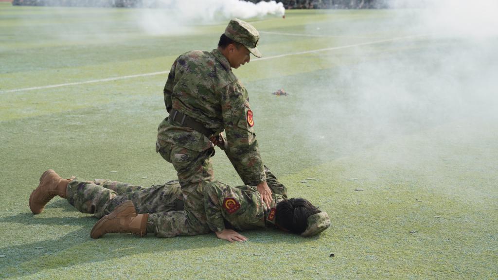 迷彩青春,淬火成钢。全体参训新生精神抖擞,以饱满的热情和昂扬的斗志投入到军训科目会操中。列队方阵步步铿锵、口号嘹亮,展现出新时代大学生蒸蒸日上的蓬勃朝气;匕首操、捕俘拳、擒敌拳动作果敢、威风凛凛,展现出当代大学生艰辛磨练后的坚韧意志;应急长棍、应急短棍气势如虹,虎虎生风,展现出不畏强敌的浩然正气;战术演练力贯千钧、锐不可挡,展现出灵活的战术运用和顽强的战斗精神,整个军训科目会操赢得了现场阵阵掌声。