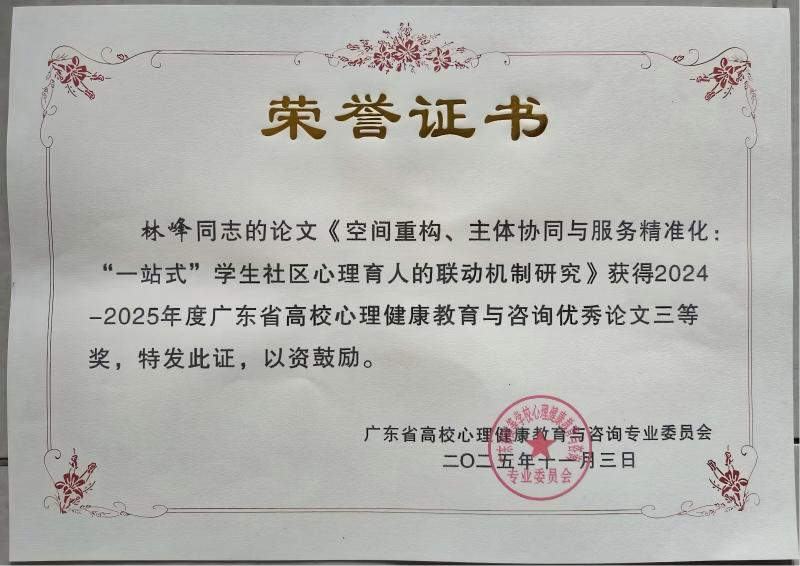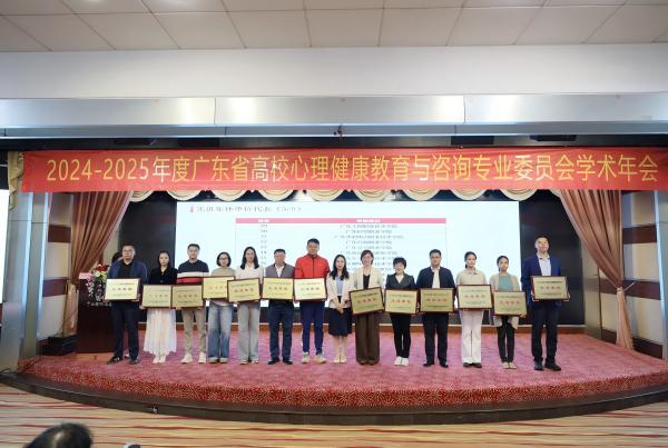 2025 年11月3-4日,2024-2025 年度广东省高校心理健康教育与咨询专业委员会学术年会在中山召开。大会由广东省高校心理健康教育与咨询专业委员会主办,全省近百所高校学生工作相关领导、专兼职心理老师代表共240余人参会。大会表彰了广东省高校心理健康教育与咨询工作先进集体71所、广东省高校优秀心理中心主任(负责人)45人、先进个人80多人、优秀论文(一等奖18个)及出版物20个。