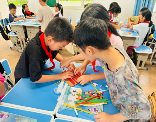 红星希望小学的非遗竹编课上,何烽瑜老师带来的精美竹编作品瞬间吸引了五年级学生的目光。她从竹条筛选、软化等基础技巧入手,一步步拆解平纹、斜纹的编织逻辑,再引导孩子们进行创意造型设计。有的孩子编织简单的杯垫,有的尝试做小篮子,指尖翻飞间,竹条在手中逐渐成型,“经纬相济”的工艺智慧与匠人精神也在潜移默化中传递给孩子。
