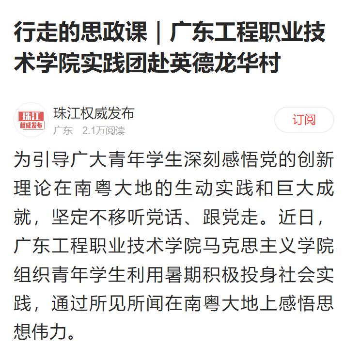 为引导广大青年学生深刻感悟党的创新理论在南粤大地的生动实践和巨大成就,坚定不移听党话、跟党走。近日,广东工程职业技术学院马克思主义学院组织青年学生利用暑期积极投身社会实践,通过所见所闻在南粤大地上感悟思想伟力。